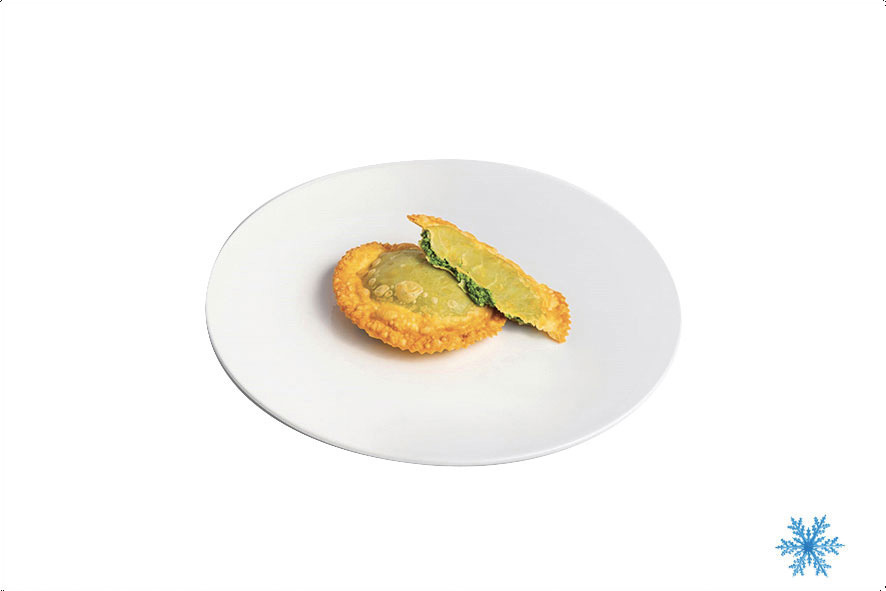 Fusion Fingers Mezzelunette mit einem Teig aus Weizen- und Roggenmehl sowie einer Füllung aus Spinat und Ricotta. Zur Zubereitung die tiefgekühlten Mezzelunette in heißem Öl bei 180°C etwa 2 Minuten frittieren, bis sie goldbraun sind. Danach abtropfen lassen, mit etwas Salz würzen und nach Belieben mit einer Dip-Sauce servieren. Ein Beutel enthält 500g; vier Beutel sind in einem Karton zusammengefasst.