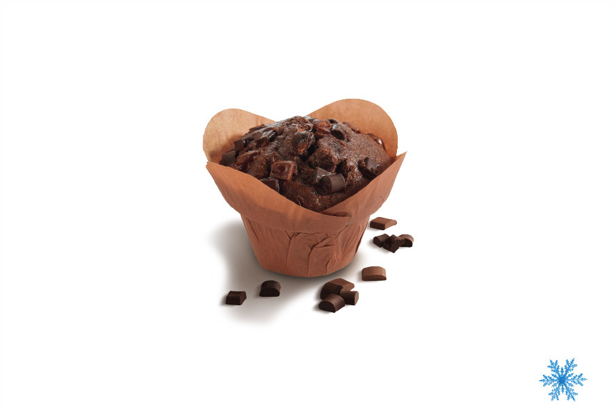 Schokoladensandwich in Buttercroissantteig; 24 % Butter im Teig, vollständig gefüllt mit den zwei typischen Zartbitterschokoladenstäbchen, mit Ei bestrichen für eine glänzende Oberfläche. Zubereitung: 13-16 Minuten bei 160-170°C backen.