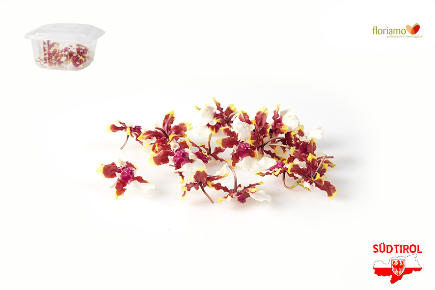 Essbare, kleinblütige Orchidee Oncidium, in der Farbe gelb braun, Durchmesser ca. 2 cm. Wohltuender Geruch nach Vanille und Schokolade. Während dem Wachstum werden keinerlei chemische Pflanzenschutzmittel verwendet! Sehr geeignet für warme Speisen, wie z.B. Risotto, wunderschön für Desserts und genial bei Fingerfood.