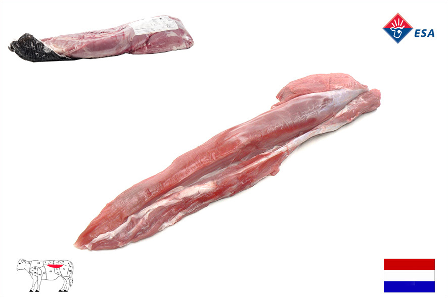 Hirschfilet mit Kette. Da es sich um in freier Wildbahn erlegtes Wild handelt ist die Verfügbarkeit nicht immer garantiert. Auch die Grösse kann je nach Jahreszeit verschieden sein. Das Filet ist das edelste Teil und eigent sich besonders zum Kurzbraten.