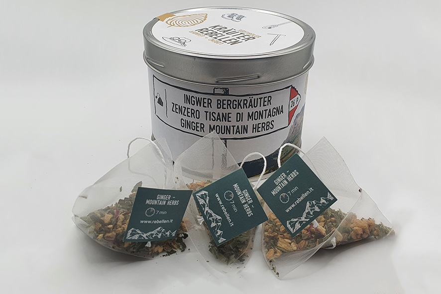 Rooibos Tee und Kornblume. Kräuterrebellen ist ein Konzept für die verschiedene Bereiche im Hotel, vom Frühstück bis zum Wellnessbereich. Die Rohstoffe sind von höchster Qualität und kommen (wo möglich) aus Südtirol. Die Dosen passen in der Teestation aus Holz und Marmor. Alm, P-D = PYRAMIDE DOSE