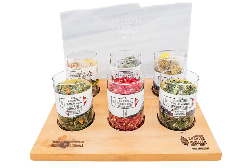 Teestation für 6 Dosen, breit, aus Holz, mit Marmorplatte. Kräuterrebellen ist ein Konzept für die verschiedene Bereich im Hotel, vom Frühstück bis zum Wellnessbereich. Die Rohstoffe sind von höchster Qualität und kommen (wo möglich) aus Südtirol. Verfügbar die eigenen Dosen und jeweils die Nachfüllelemente.