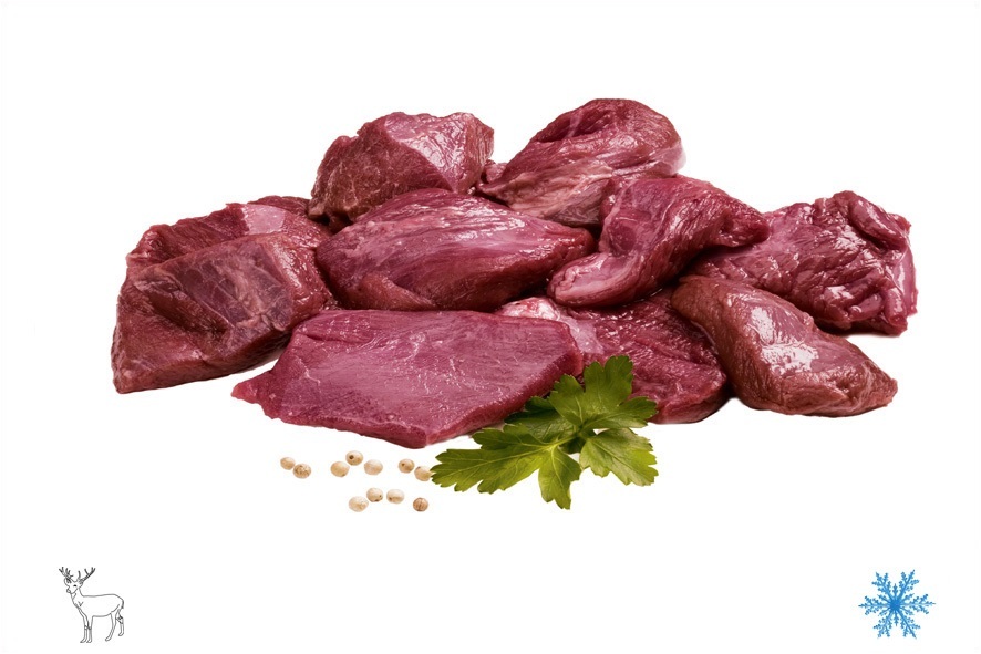 Coscia senz'osso di capriolo. La carne proviene di caprioli abbattuti in diverse riserve di caccia in tutto l'Europa. È un taglio ideale per fare arrosto o per fare spezzatino.